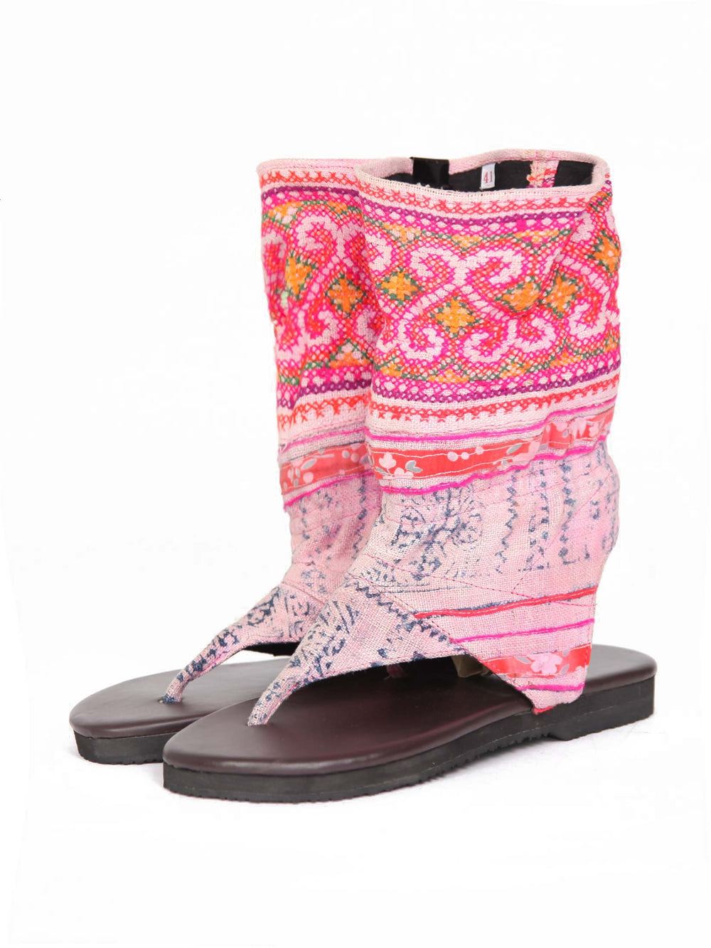 Vintage Hmong Tribal Print Flat Bootie Sandal | Light pink Hmon