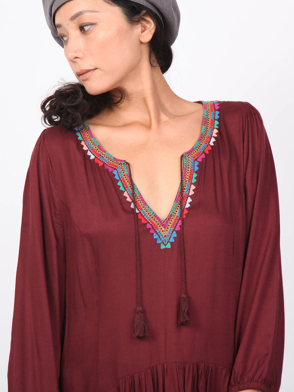 Beautiful dress with embroidery around the neckline and hemline. Bordeaux color is perfect for the autumn season. coordinate with jeans or leggings at the cold weather.