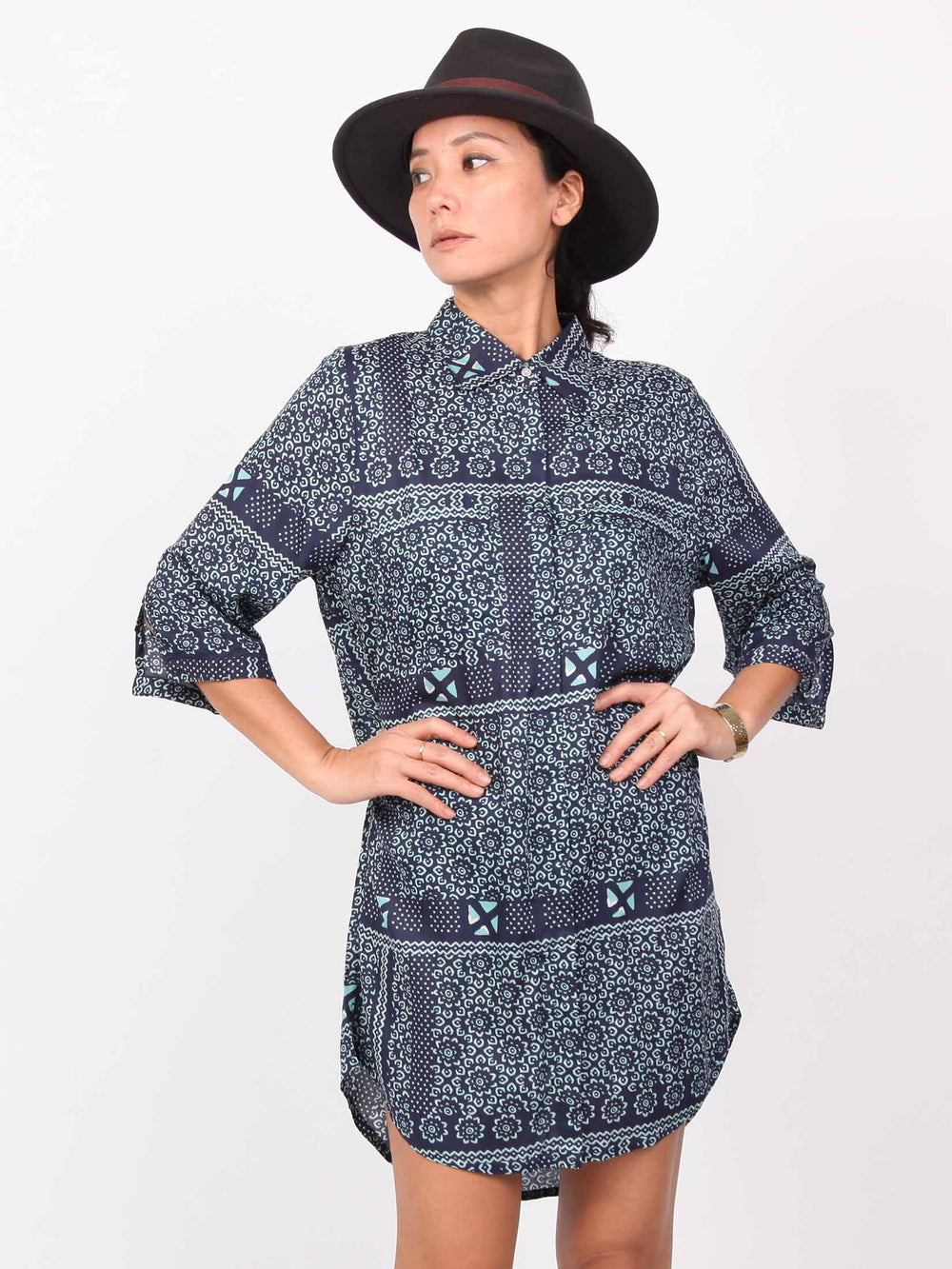 The batik-print shirtdress does double duty as a cover-up and a laid-back shirtdress option. Roll up the sleeves and tuck into a pair of clean-lined jeans for a modern take on bohemian.