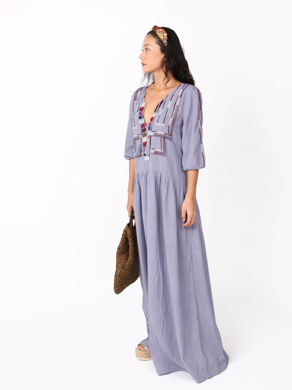 Embroidered Boho Relaxed Fit Cotton Maxi Dress has a Keyhole neckline with draped sleeves and dropped waistline so relaxing vintage style. Beautiful embroidered detailing at the chest with Tassel finishing.