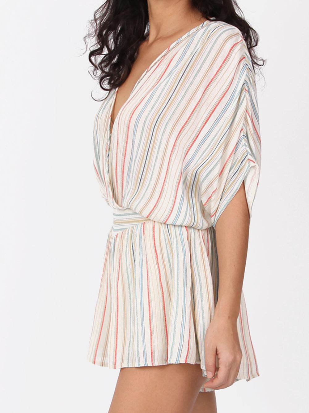 Drapey romper from Dress Forum featuring a creamy stripe print with trimming at the neckline. Cut in a flowing fit with a deep surplice neckline and wide sleeves. Cinched at the back waist with elastic banding.