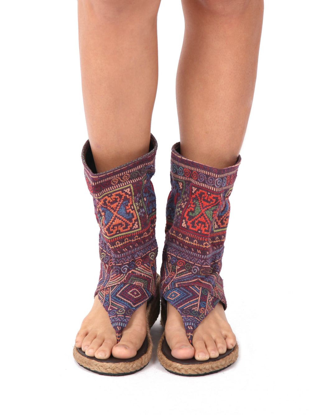 This Wedge Boho Bootie Sandal uses a woven tribal pattern fabric as upper. It gives a raw and artistic aesthetic, combined with the braided wedge heel. The bootie-style upper has an appropriate length and the heavy fabric maintains it’s shaped, as you walk around in these bootie sandals.