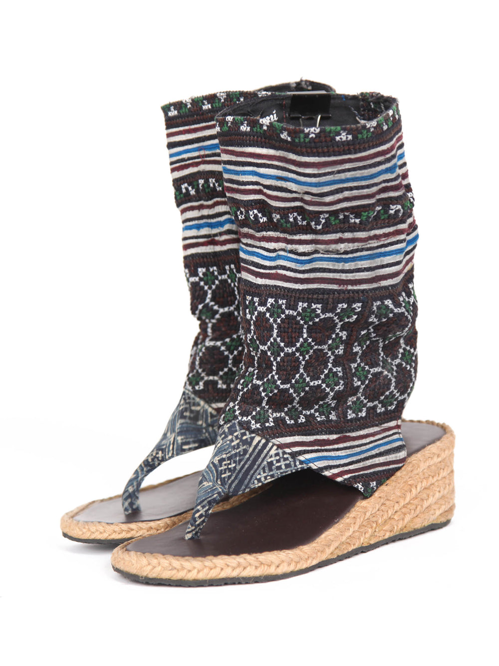 This Wedge Bootie Sandal features real vintage Hmong tribe fabric. The woven fabric is lightweight and features traditional Hmong patterns. The wedge heel features jute braidings that add to the whole tribal aesthetic of this sandal and bootie combination. It’s a modern take on booties with an ancient textile. These shoes are made from limited vintage Hmong fabric, which is why each piece of fabric exclusively produces three to four pairs.